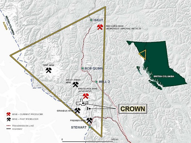The 16,468 hectare Crown Property is located 45 minutes from the town of Stewart BC, and situated in the Golden Triangle of British Columbia. Portions of the Property is accessible by gravel roads to the southeastern concessions. The Crown claims cover the southern portion of a signification gold copper belt and is on trend with Seabridge Gold’s KSM Deposit to the north. Earlier exploration programs within the Crown Project area have focused on discovery of high-grade precious metal veins, VMS/ subaqueous hotspring mineralization, or porphyry-style gold-copper mineralization, similar to some of the deposits found on nearby properties. Work has been undertaken primarily in four areas of the Property (Orion, Fairweather, Delta and Electrum Occurrences) where high-grade precious metal veins, VMS/ subaqueous hotspring mineralization and porphyry-style gold- copper mineralization has been revealed. Historical work has primarily been concentrated in the four previously mentioned areas, leaving extensive regions of this large property under-explored. Recent geological reconnaissance and rock sampling have also been concentrated in areas near the edges of retreating glacial ice sheets and have successfully discovered freshly exposed mineralization.