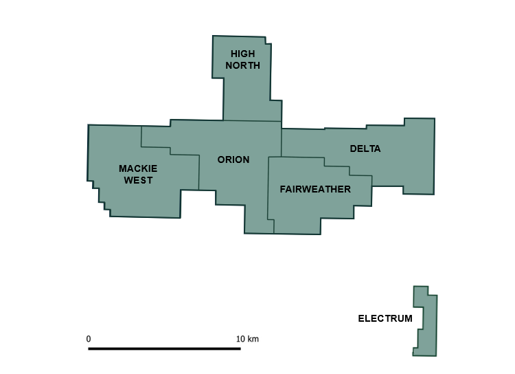 - 4 km to the north of the Scottie Gold Deposit where mining from 1981 to 1985 mining totalled 160,264 tonnes at an average grade of 16.2 g/t gold, recovering 95,000 ounces of gold and 52,200 ounces of silver;