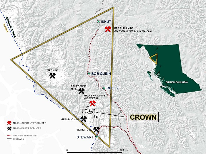 The 16,468 hectare Crown Property is located 45 minutes from the town of Stewart BC, and situated in the Golden Triangle of British Columbia. Portions of the Property is accessible by gravel roads to the southeastern concessions. The Crown claims cover the southern portion of a signification gold copper belt and is on trend with Seabridge Gold’s KSM Deposit to the north. Earlier exploration programs within the Crown Project area have focused on discovery of high-grade precious metal veins, VMS/ subaqueous hotspring mineralization, or porphyry-style gold-copper mineralization, similar to some of the deposits found on nearby properties. Work has been undertaken primarily in four areas of the Property (Orion, Fairweather, Delta and Electrum Occurrences) where high-grade precious metal veins, VMS/ subaqueous hotspring mineralization and porphyry-style gold- copper mineralization has been revealed. Historical work has primarily been concentrated in the four previously mentioned areas, leaving extensive regions of this large property under-explored. Recent geological reconnaissance and rock sampling have also been concentrated in areas near the edges of retreating glacial ice sheets and have successfully discovered freshly exposed mineralization.