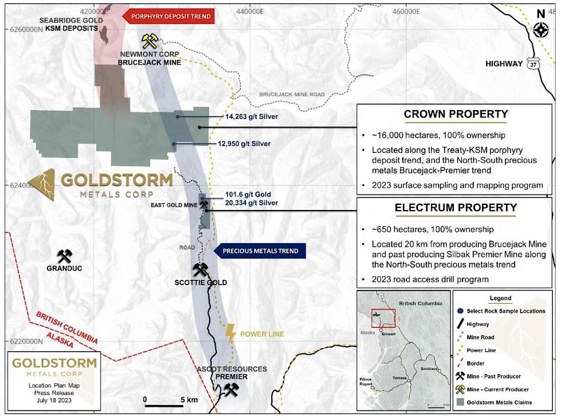 Goldstorm Metals Corp. is a precious and base metals exploration company with a large strategic land position in the Golden Triangle of British Columbia, an area that hosts some of the largest and highest-grade gold deposits in the world. Goldstorm’s flagship projects Crown and Electrum cover an area that totals approximately 16,469 hectares over 7 concessions, of which 6 are contiguous. The Crown Project is situated directly south of Seabridge Gold’s KSM gold-copper deposits and Newcrest Gold’s Brucejack/Valley of the Kings gold mine. Electrum, also located in the Golden Triangle of BC, is situated directly between Newmont Corporation’s Brucejack Mine, approximately 20 kilometers to the north, and the past producing Silbak Premier mine, 25 kilometers to the south.