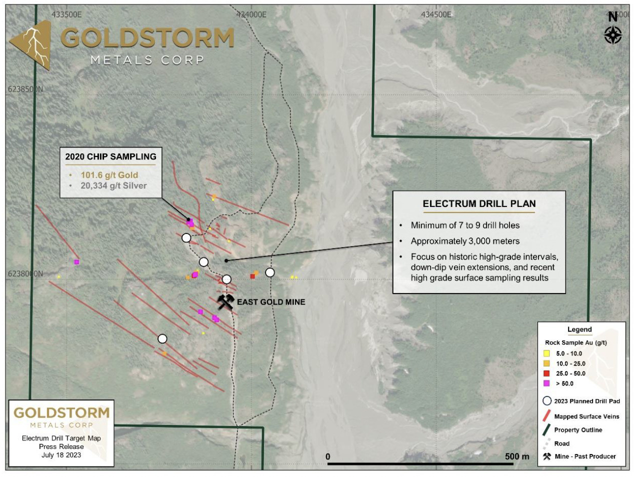 The Program at Electrum will total approximately 3,000 meters (m) over 7 to 9 drill holes targeting high-grade gold and silver intervals reported from previous drill programs by other operators. In prior programs, several of the drill-tested targets returned high-grade results, including 31.40 g/t gold and 19.0 g/t silver over 2.0 m and 440.8 g/t gold and 400.0 g/t silver over 0.52 m. Drill targets will also include areas of gold-bearing surface samples collected by Goldstorm over the past year within the historical East Gold Mine area, where intermittent small-scale, underground production between 1939 and 1965 produced 3,816 ounces of gold and 2,442 ounces of silver from 45 tons of hand selected ore. Sampling and mapping by Tudor Gold Corp. in 2020 further support this prospective target, as a verification chip sample taken within this area returned values of 101.60 g/t gold and 20,334.0 g/t silver. Click to view the Electrum drill areas.