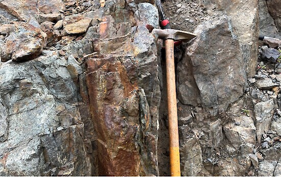 Photo 2: Grab Sample A0519498 from freshly exposed massive-sulphide veining hosting semi-massive pyrite, sphalerite, and minor malachite that yielded 11.30 g/t gold, 89.02 g/t silver, 0.82 % copper, and 1.37 % zinc.