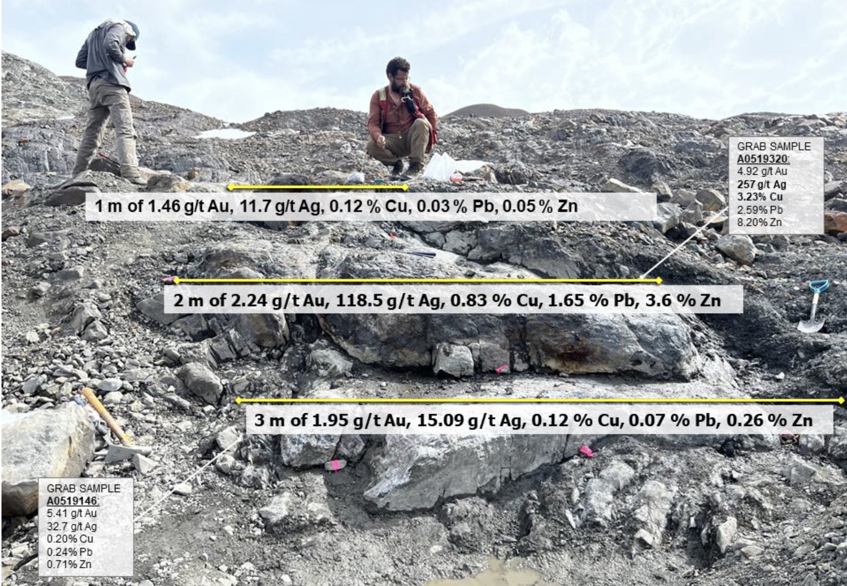 Photo 2: Grab Sample A0519498 from freshly exposed massive-sulphide veining hosting semi-massive pyrite, sphalerite, and minor malachite that yielded 11.30 g/t gold, 89.02 g/t silver, 0.82 % copper, and 1.37 % zinc.