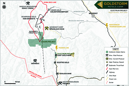 Goldstorm Metals Corp. is a precious and base metals exploration company with a large strategic land position in the Golden Triangle of British Columbia, an area that hosts some of the largest and highest-grade gold deposits in the world. Goldstorm’s flagship projects Crown and Electrum cover an area that totals approximately 16,469 hectares over 7 concessions, of which 6 are contiguous. The Crown Project is situated directly south of Seabridge Gold’s KSM gold-copper deposits and Newcrest Gold’s Brucejack/Valley of the Kings gold mine. Electrum, also located in the Golden Triangle of BC, is situated directly between Newmont Corporation’s Brucejack Mine, approximately 20 kilometers to the north, and the past producing Silbak Premier mine, 20 kilometers to the south.