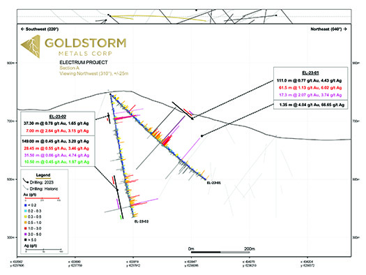 Ken Konkin P. Geo., President and CEO comments; “Our team is very pleased with the results from the initial two holes that were completed on Goldstorm’s maiden exploration drill program at Electrum. The holes intersected gold and silver mineralization typical of the grades that were reported in the discovery holes at Tudor Gold’s Treaty Creek Project, 35 km to the north, particularly within the gold-dominant domains of the Goldstorm Deposit. The originally discovered precious metal mineralization at Electrum underlies a prominent silicified knob, which was explored by historical drill holes that were oriented in the opposite direction from the newly discovered zone. Hole EL-23-01 contains significant gold mineralization with some anomalous silver at the bottom of the hole, while drill hole EL-23-02 ended in gold mineralization. Although the mineralized intercepts are approximately 200 m apart, the mineral continuity appears promising for this system. Further drilling is required to fully test this target laterally and to depth.”