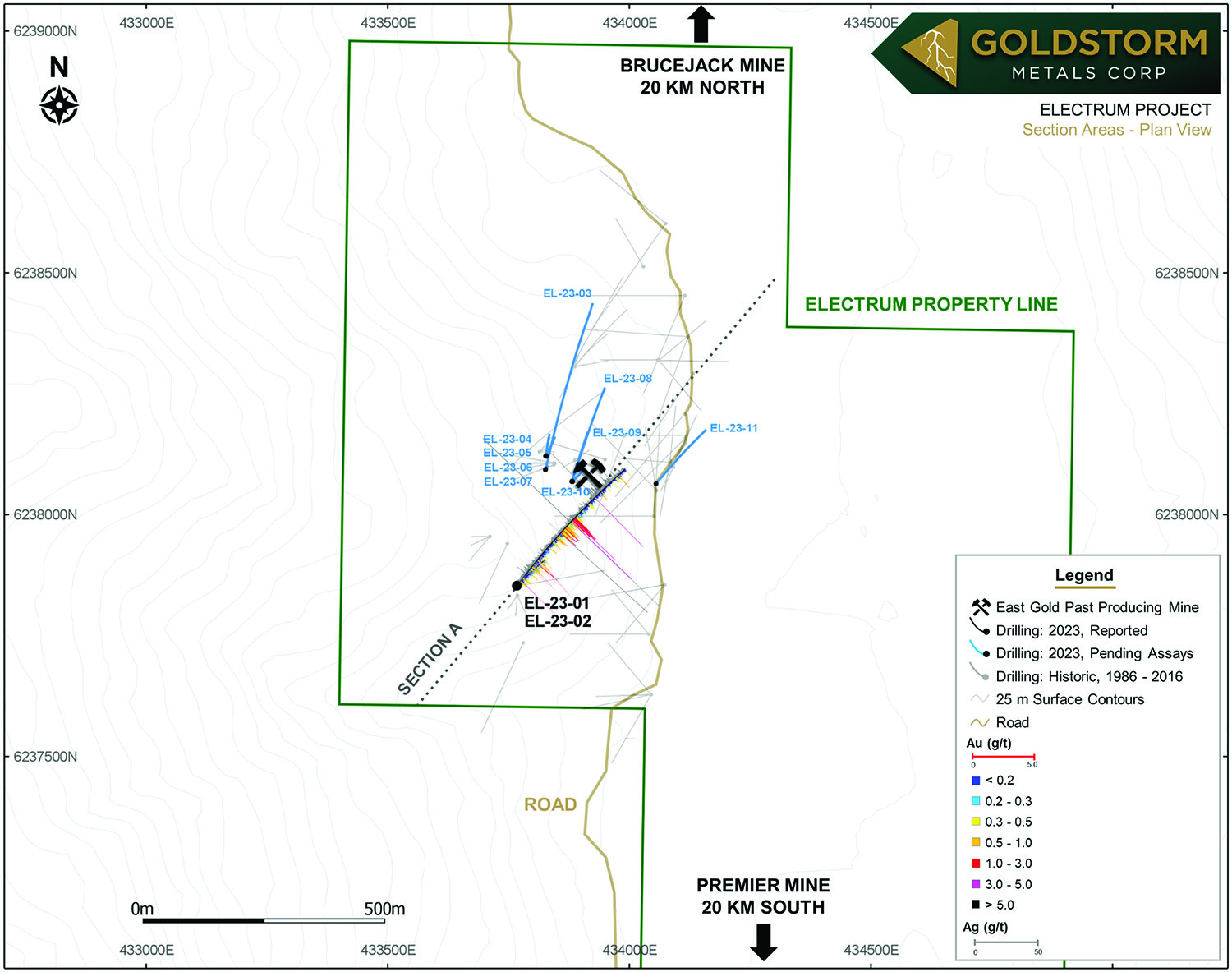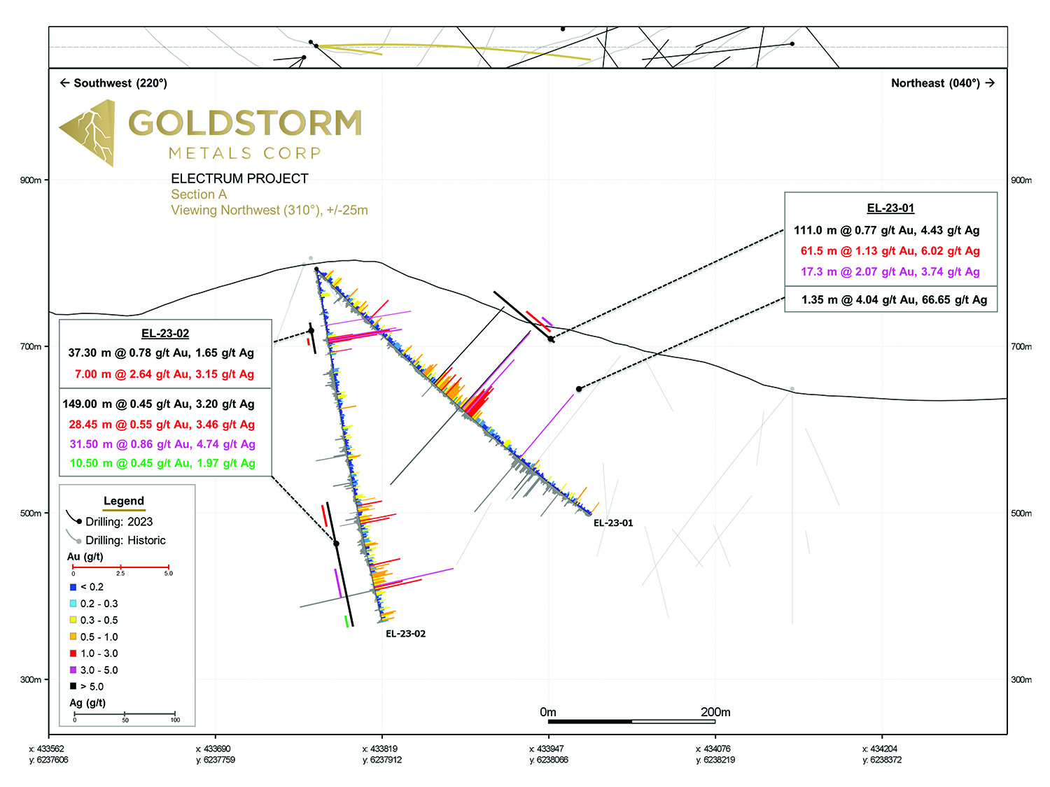 Ken Konkin P. Geo., President and CEO comments; “Our team is very pleased with the results from the initial two holes that were completed on Goldstorm’s maiden exploration drill program at Electrum. The holes intersected gold and silver mineralization typical of the grades that were reported in the discovery holes at Tudor Gold’s Treaty Creek Project, 35 km to the north, particularly within the gold-dominant domains of the Goldstorm Deposit. The originally discovered precious metal mineralization at Electrum underlies a prominent silicified knob, which was explored by historical drill holes that were oriented in the opposite direction from the newly discovered zone. Hole EL-23-01 contains significant gold mineralization with some anomalous silver at the bottom of the hole, while drill hole EL-23-02 ended in gold mineralization. Although the mineralized intercepts are approximately 200 m apart, the mineral continuity appears promising for this system. Further drilling is required to fully test this target laterally and to depth.”