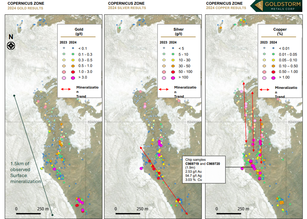 - 16 samples taken within the Copernicus Zone returned greater than 1% copper, with one sample (C969842) assaying 0.58 g/t gold, 625 g/t silver, and 6.57% copper at the original Copernicus showing