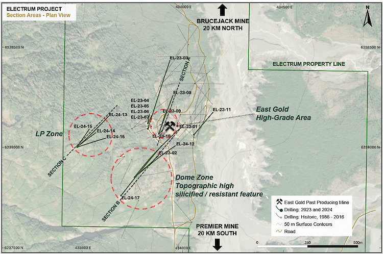 The Electrum Property is road accessible from the town of Stewart and located directly between Newmont Corporation’s Brucejack Mine, approximately 20 kilometers (km) to the north, and the past producing Silbak Premier mine, 20 kilometers to the south. A well-developed 40 km road directly links the property to the bulk tonnage shipping terminals in Stewart and electrical power lines come within 18 km of the property and can be continued along the existing haul road. In addition to high grade gold and silver mineralization targets, Electrum hosts geophysical anomalies at depth beneath the main vein zones, as well as an area southwest of the East Gold Mine that shows evidence of potential porphyry-style mineralization. Work programs completed by the Company include drilling in 2023 and 2024.