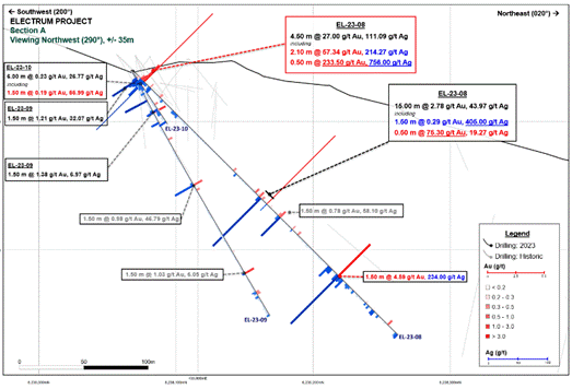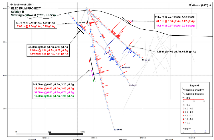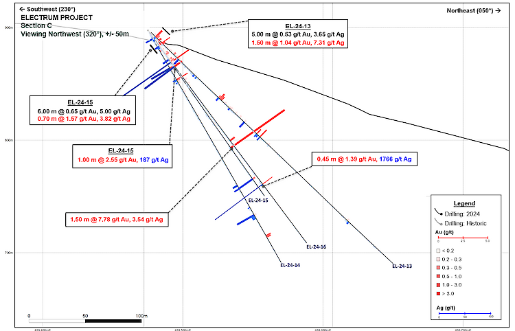 Drilling by previous operators on Electrum encountered gold-silver mineralization at depths of more than 200 meters from surface, with several holes intersecting relatively wide zones containing narrow quartz-sulfide stockwork veins that returned moderate precious metal values. These intercepts are located beneath surface exposures that were subsequently blasted, trenched and bulk sampled in an area referred to as the New Blast Zone. Here, a 3.8 tonne bulk sample that was collected from a 5-meter-wide zone averaged 2.82 g/t gold, 539.0 g/t silver, 1.96 % lead and 1.97 % zinc. Localized veins, found within some of the wider drill intervals, contain electrum and silver sulfosalt minerals that have returned significant silver and gold values over narrow widths.